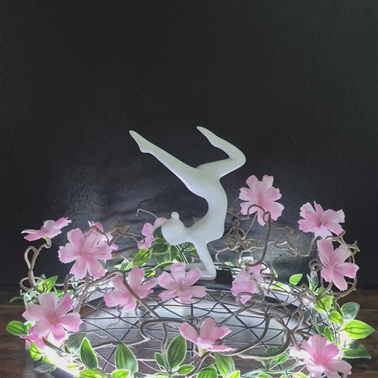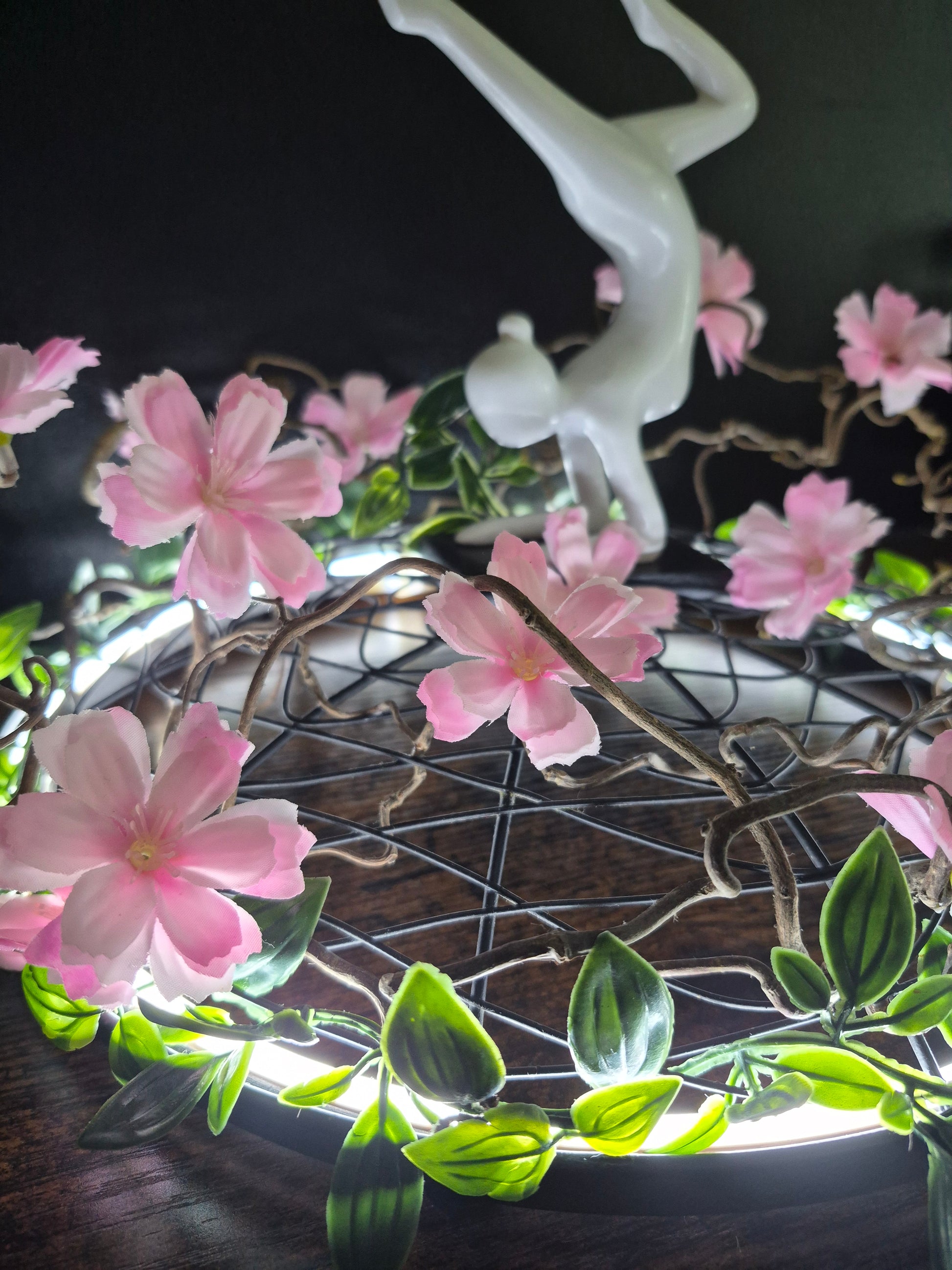 Cette création unique représente une silhouette blanche en mouvement, comme suspendue dans une danse légère. Elle est entourée d’une couronne de fleurs roses, de feuillages fins et de tiges délicatement torsadées. L’éclairage circulaire intégré apporte une atmosphère douce et enchanteresse, accentuant la finesse de la scène.