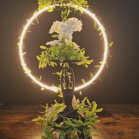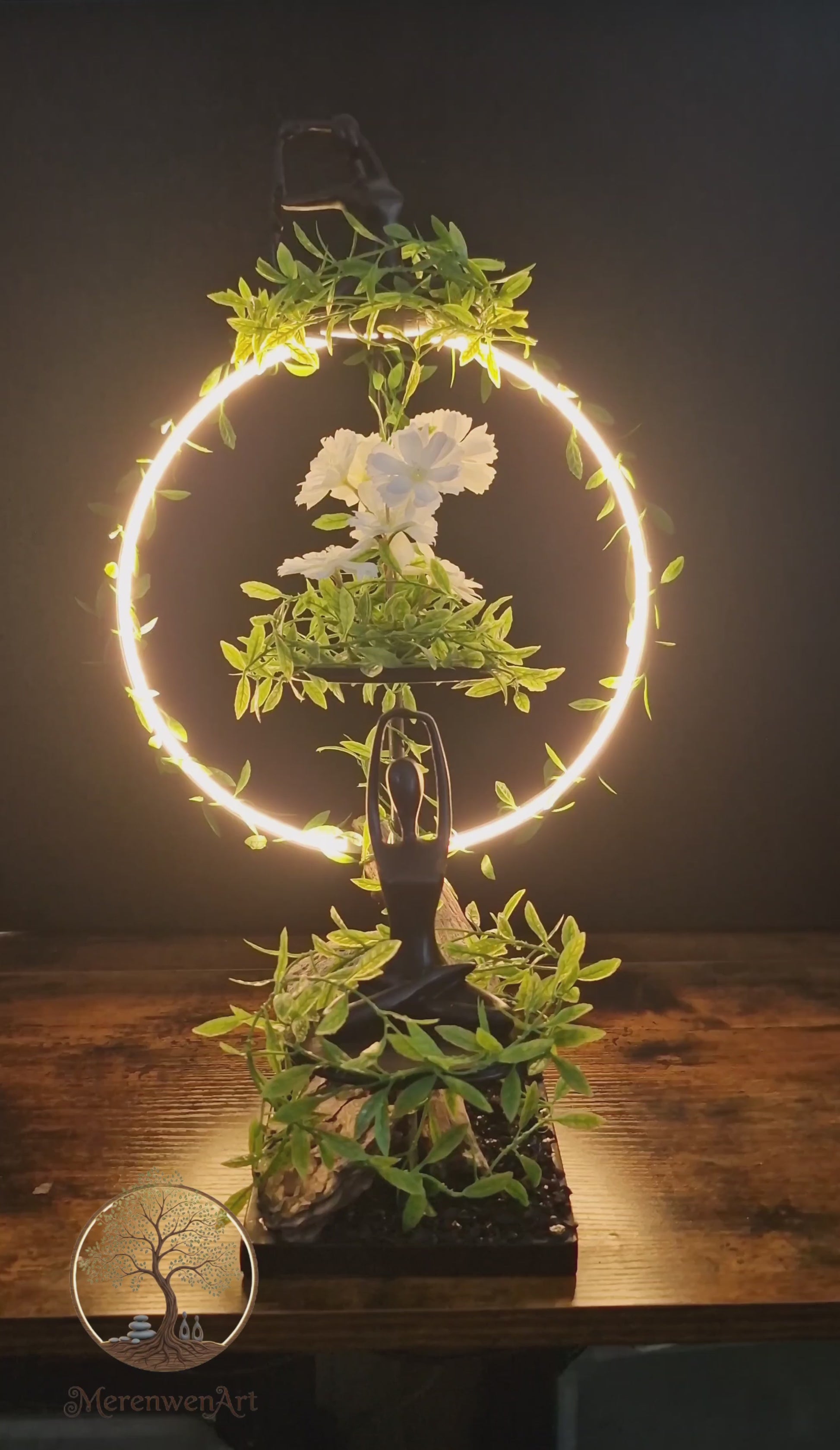 Harmonie d’Âmes est une pièce unique, née de la réinvention d’un ancien porte-plante en fer forgé. Sur son socle de bois et de gravier noir reposent deux silhouettes en méditation, entourées de feuilles verdoyantes et d’une lumière douce. Cette création unit matière brute et poésie lumineuse pour offrir une atmosphère paisible et spirituelle. Parfaite pour un coin zen, un espace de méditation ou simplement pour apporter une touche féerique et apaisante à votre intérieur. 🌙