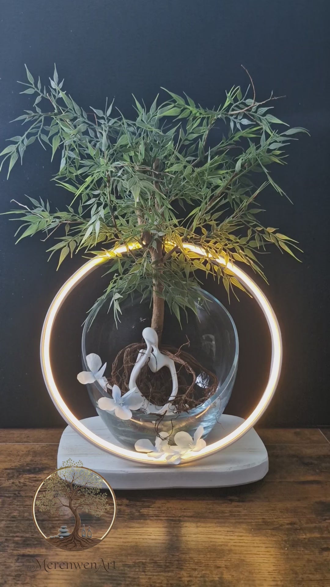 Réalisée à partir d’un ancien vase design, elle abrite une statuette entremêlée aux racines séchées d’une ancienne plante, reposant sur un lit de verdure et ornée de fleurs bleutées. Le tout est sublimé par un cercle de lumière LED réglable, qui diffuse une aura douce et apaisante.
