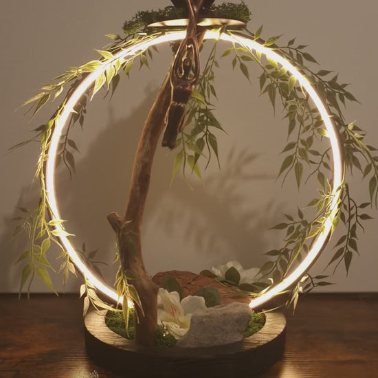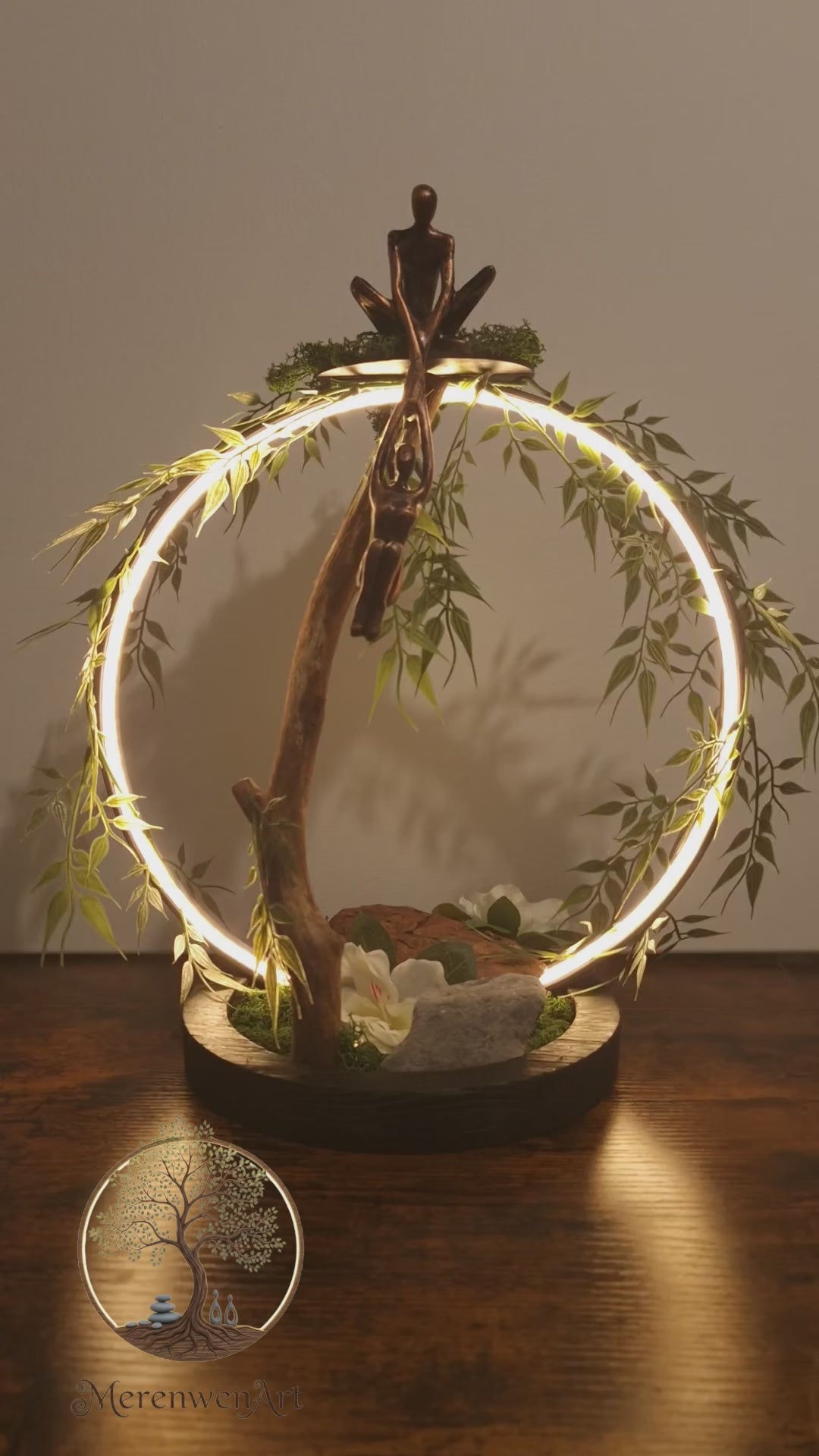 Plongez dans un univers où l’art et la nature se rencontrent 🍃 Cette lampe d’ambiance unique, faite à la main, mêle bois naturel, lumière douce et symbolique d’amour et de connexion. La lumière circulaire illumine délicatement deux silhouettes en équilibre, suspendues entre terre et lumière, comme une ode à la confiance et à la sérénité 🌕 Chaque détail — la branche, les fleurs, la verdure — est choisi avec soin pour créer une atmosphère zen, apaisante et un brin féerique. Une pièce qui apporte chaleur, sens et poésie à votre intérieur.