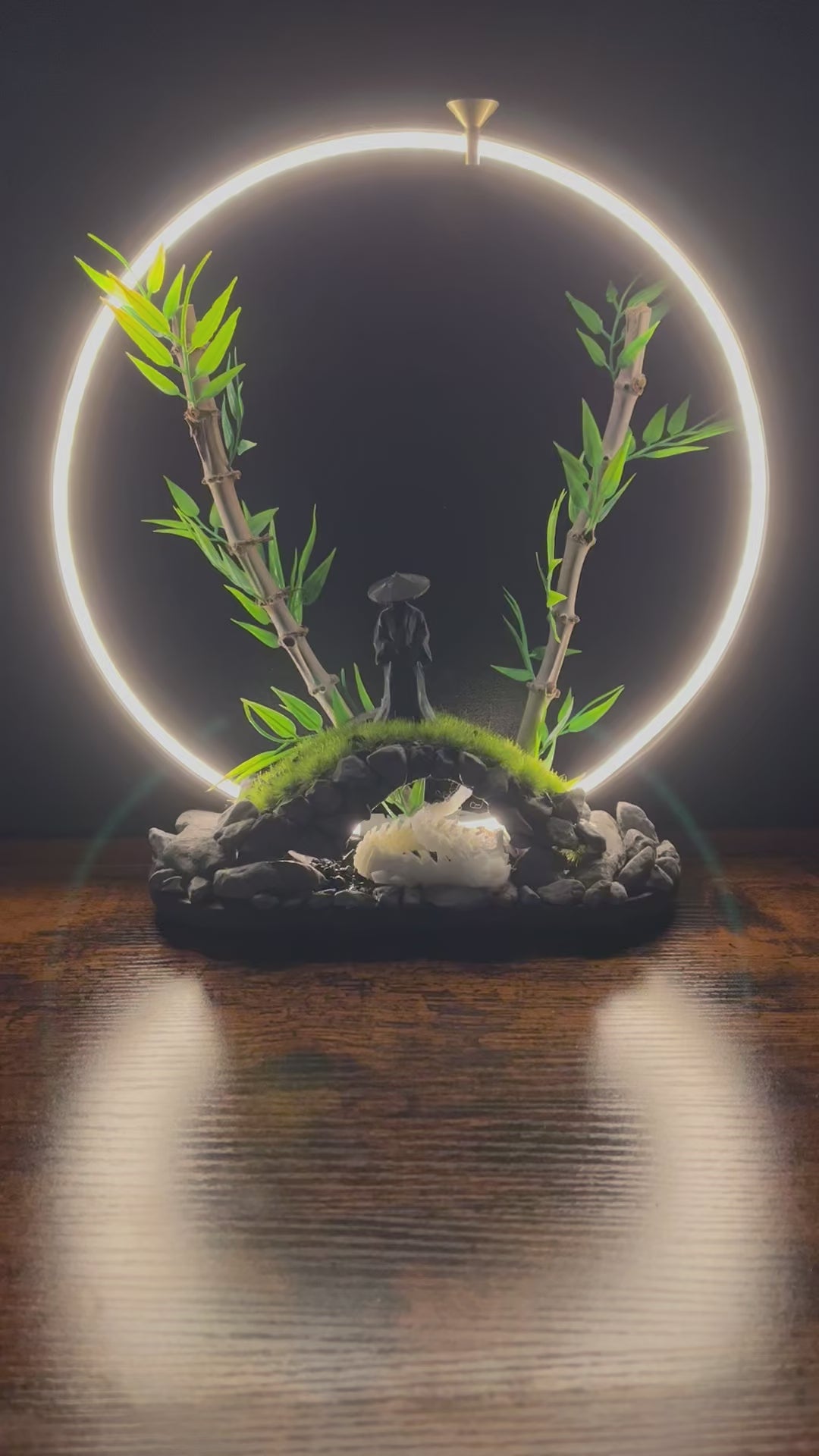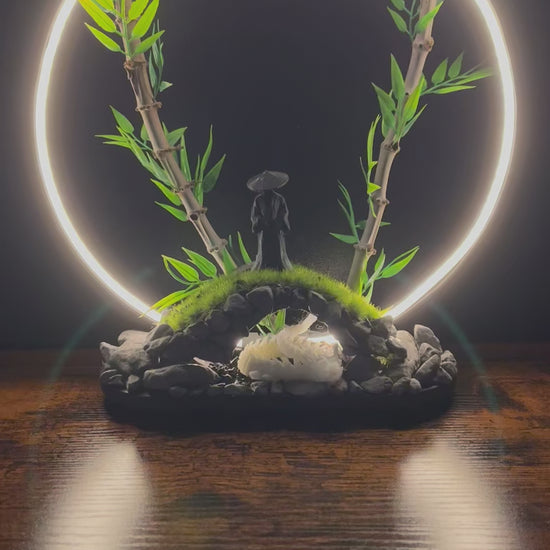 Le Gardien du Dragon Blanc est une lampe d’ambiance artisanale alliant design épuré et symbolique spirituelle. Réalisée sur une base de pierres naturelles et de mousse artificielle, cette pièce met en scène un voyageur solitaire veillant sur un dragon légendaire, sous un cercle lumineux évoquant la lune et le cycle de la vie. Les tiges de bambou apportent une touche végétale authentique, tandis que la lumière douce crée une atmosphère zen et poétique. Chaque détail est pensé pour inviter au calme, à la méditation et à la rêverie.