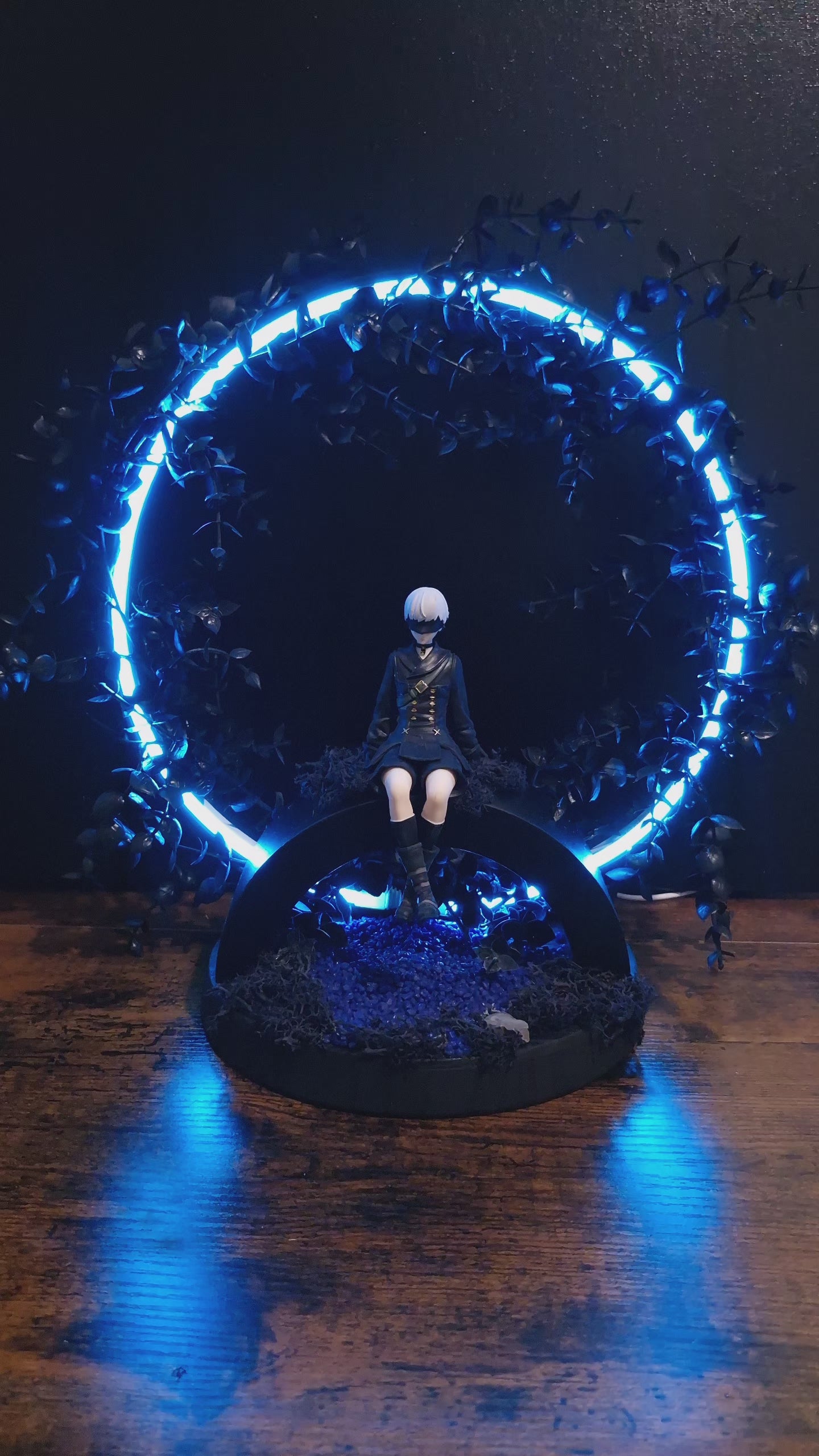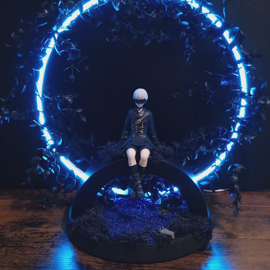 Plongez dans un univers entre ombre et lumière avec “Le Gardien du Pont d’Ombre”, une création artisanale au charme envoûtant. Sur un bougeoir en bois revisité en pont, un personnage inspiré d’un monde vidéoludique contemple le silence d’un paysage lunaire. Sous ses pieds, un lit de graviers bleus reflète une lumière douce, évoquant l’eau tranquille d’une rivière nocturne. Le tout est enveloppé de feuillage artificiel noir, entrelaçant un cercle lumineux qui diffuse une aura presque magique.