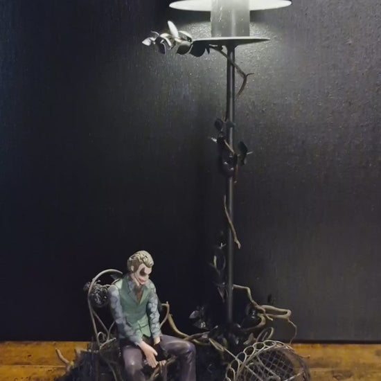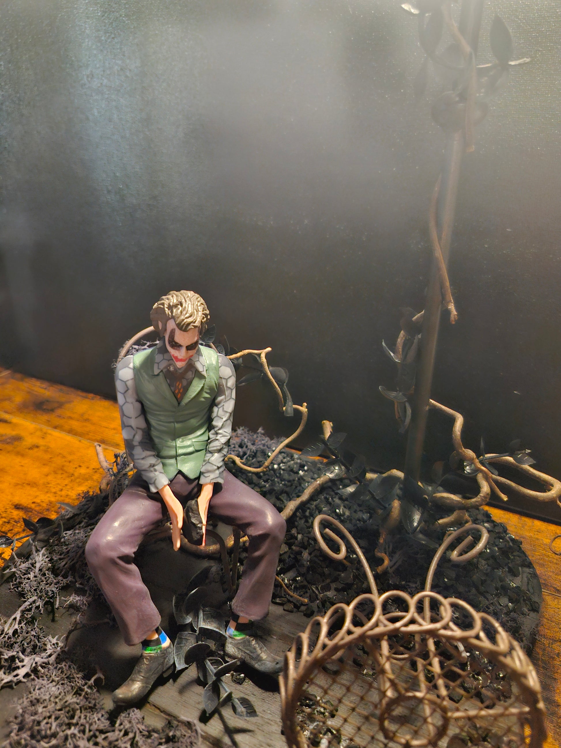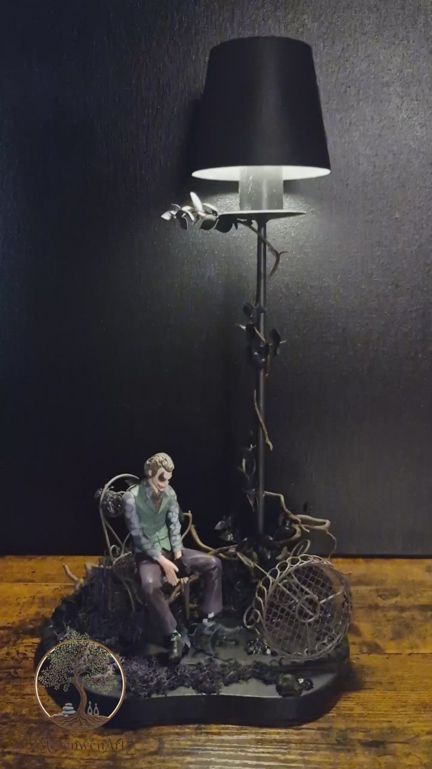 Le Jardin du Chaos – Hommage au Joker Cette création singulière rend hommage à l’univers du Joker, symbole de dualité, de désordre et d’émotion brute. Réalisée à partir de fer forgé, bois et végétation sombre, elle allie la froideur du métal à la poésie de la lumière. La figurine, assise au cœur de cette scène, incarne la réflexion intérieure et le contraste entre rire et tragédie.