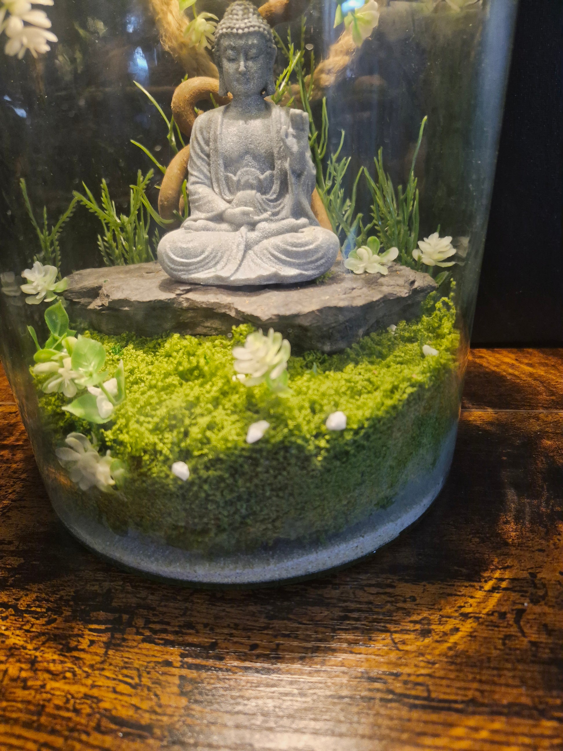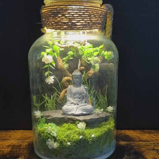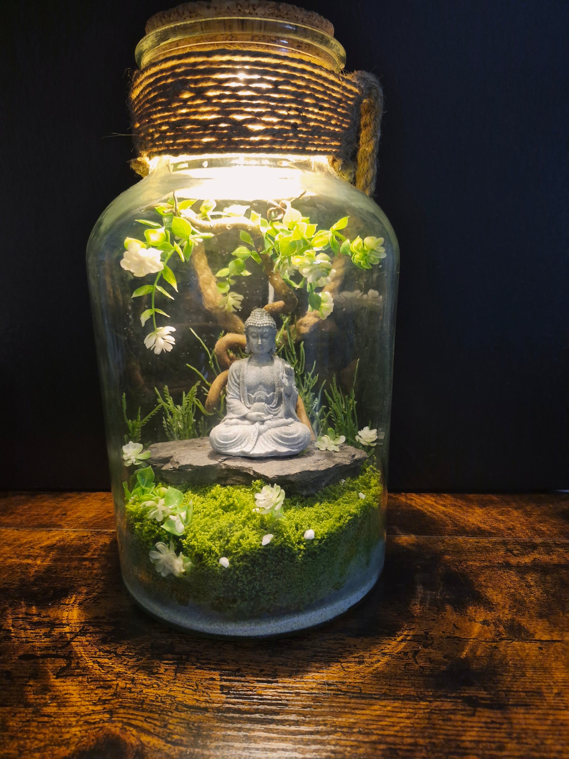 est une création artisanale lumineuse qui met en scène un décor zen miniature dans un grand bocal de verre. Une statue délicate, posée sur une roche naturelle, domine un tapis de mousse stabilisée et de fleurs fines. L’éclairage intégré crée une atmosphère apaisante, idéale pour un coin détente ou une décoration inspirée du bien-être.