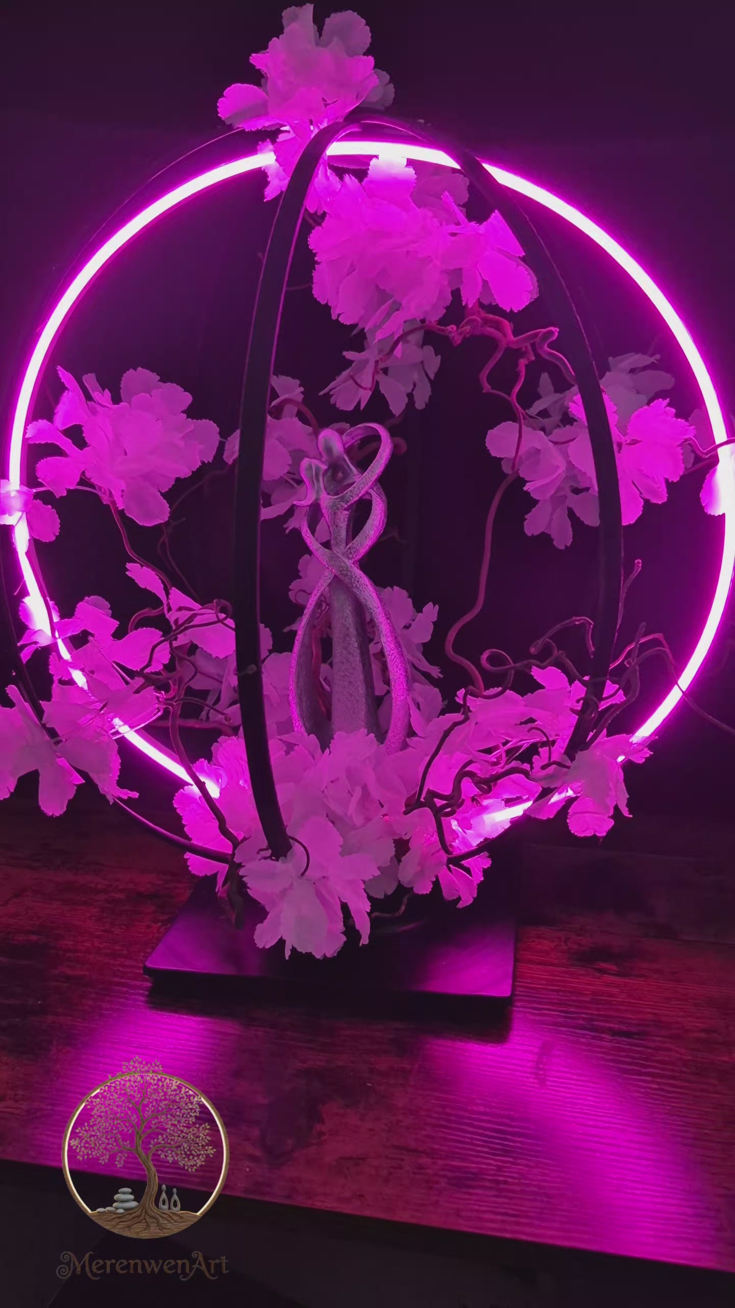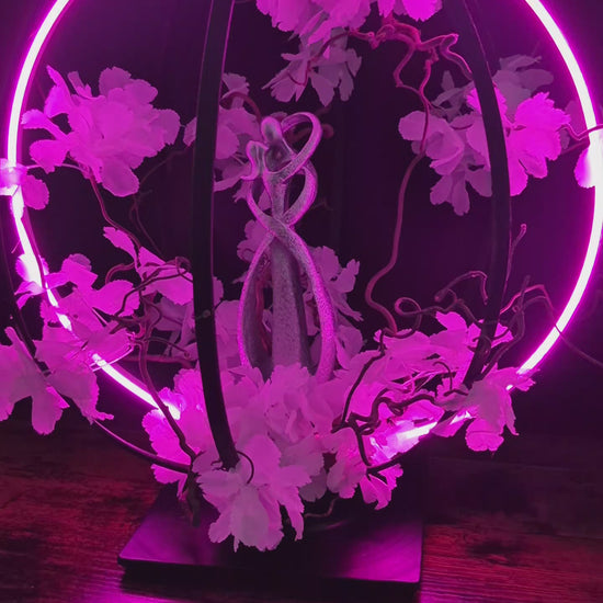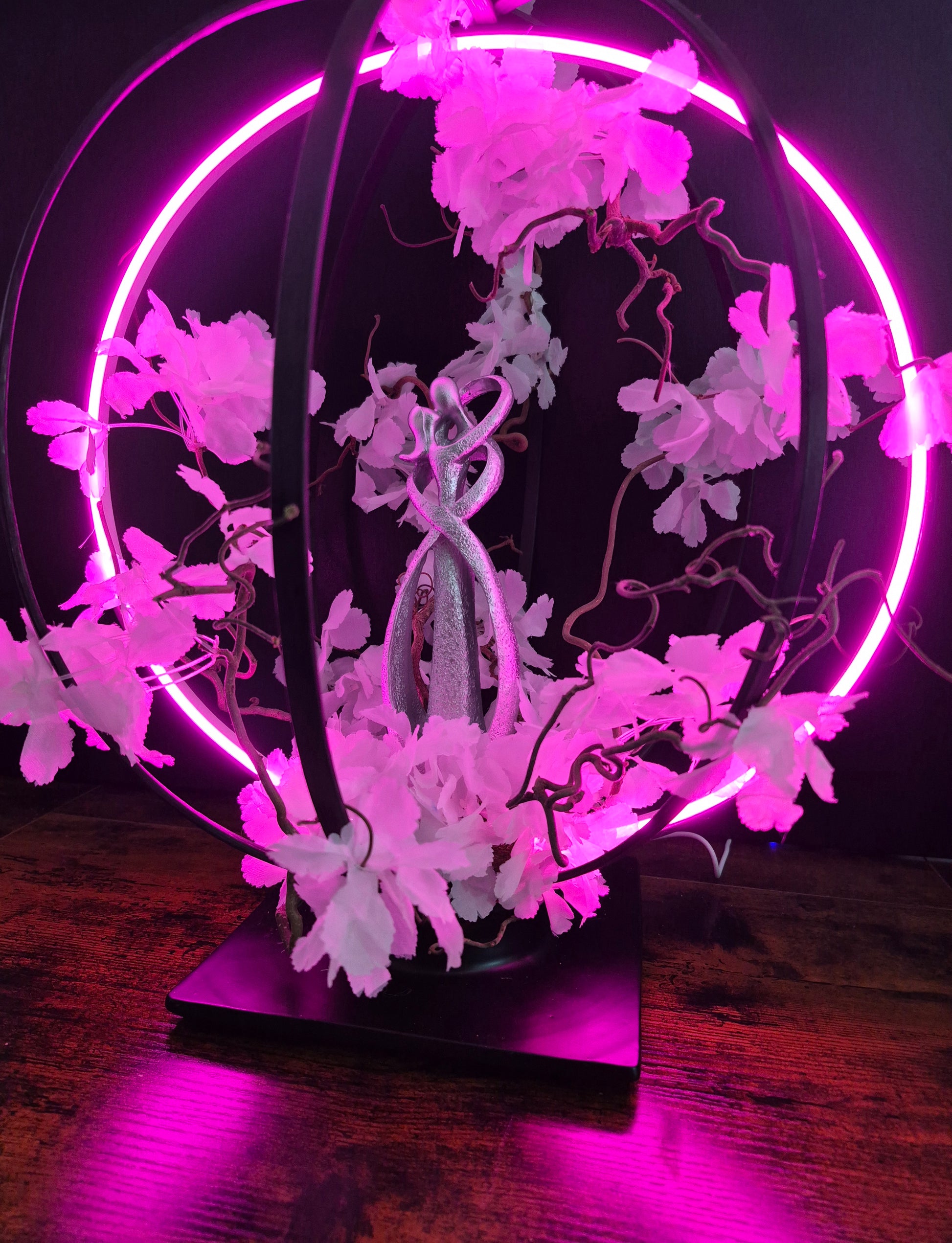 Titre : L’Étreinte Éternelle – Création Lumineuse Dimensions : env. 50 cm (hauteur) × 40 cm (largeur) Matériaux : structure céramique et bois, anneau LED, fleurs artificielles, branches décoratives, statuette au centre.