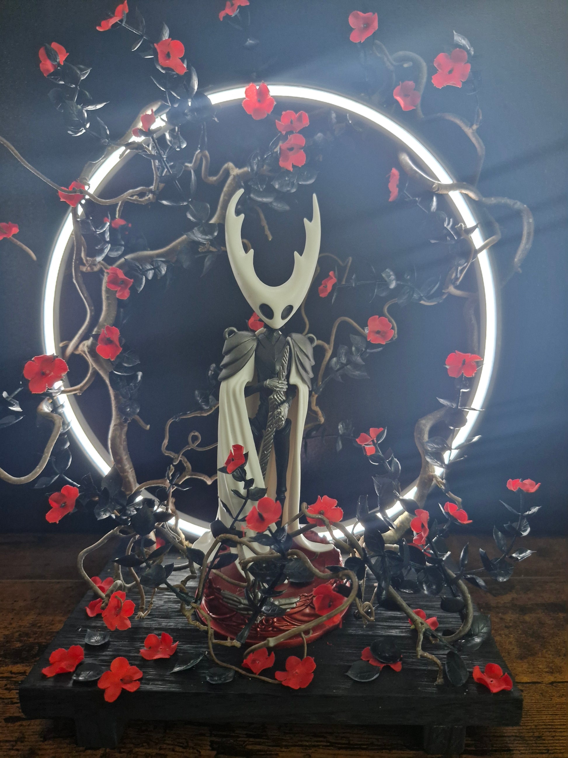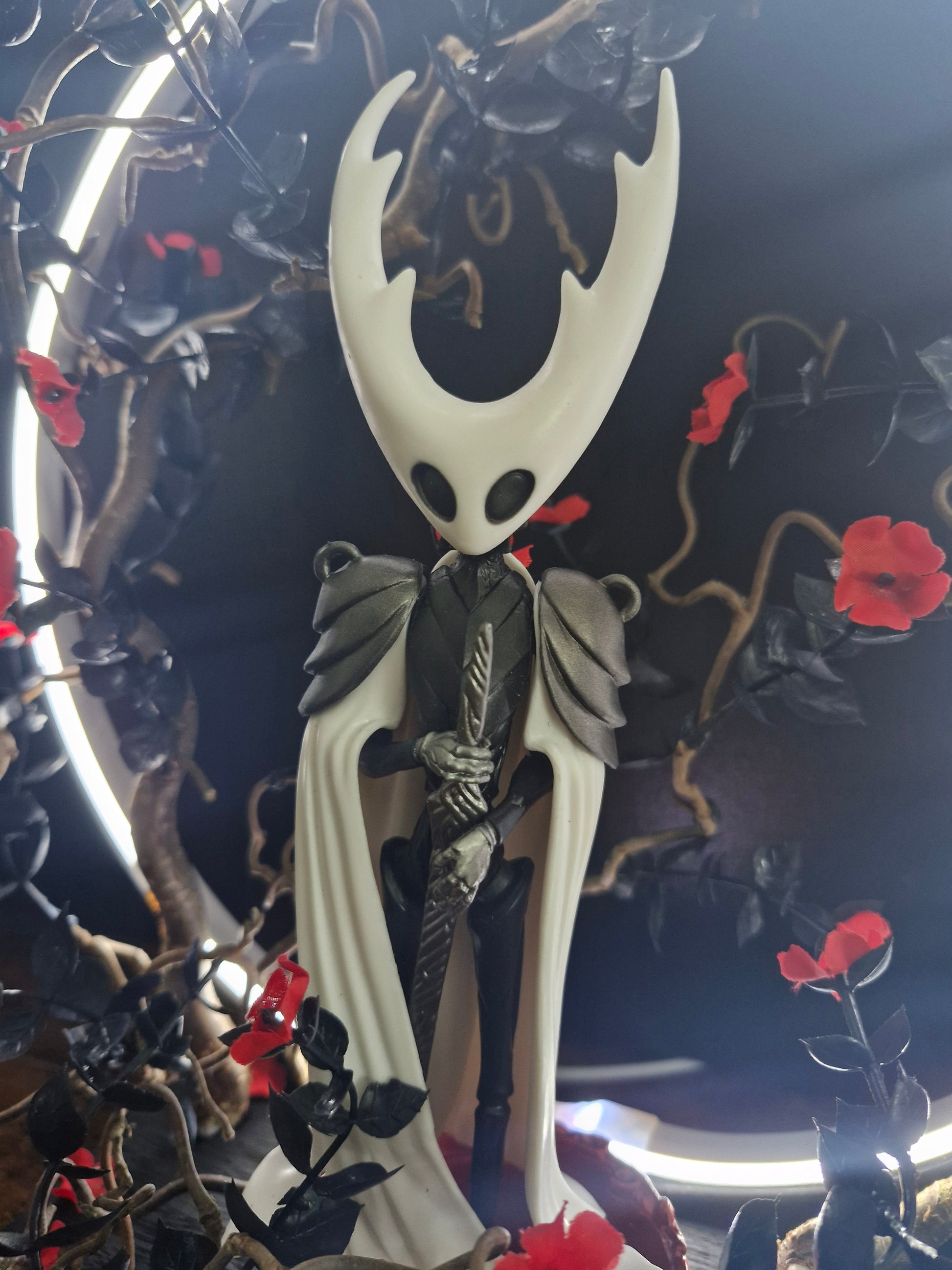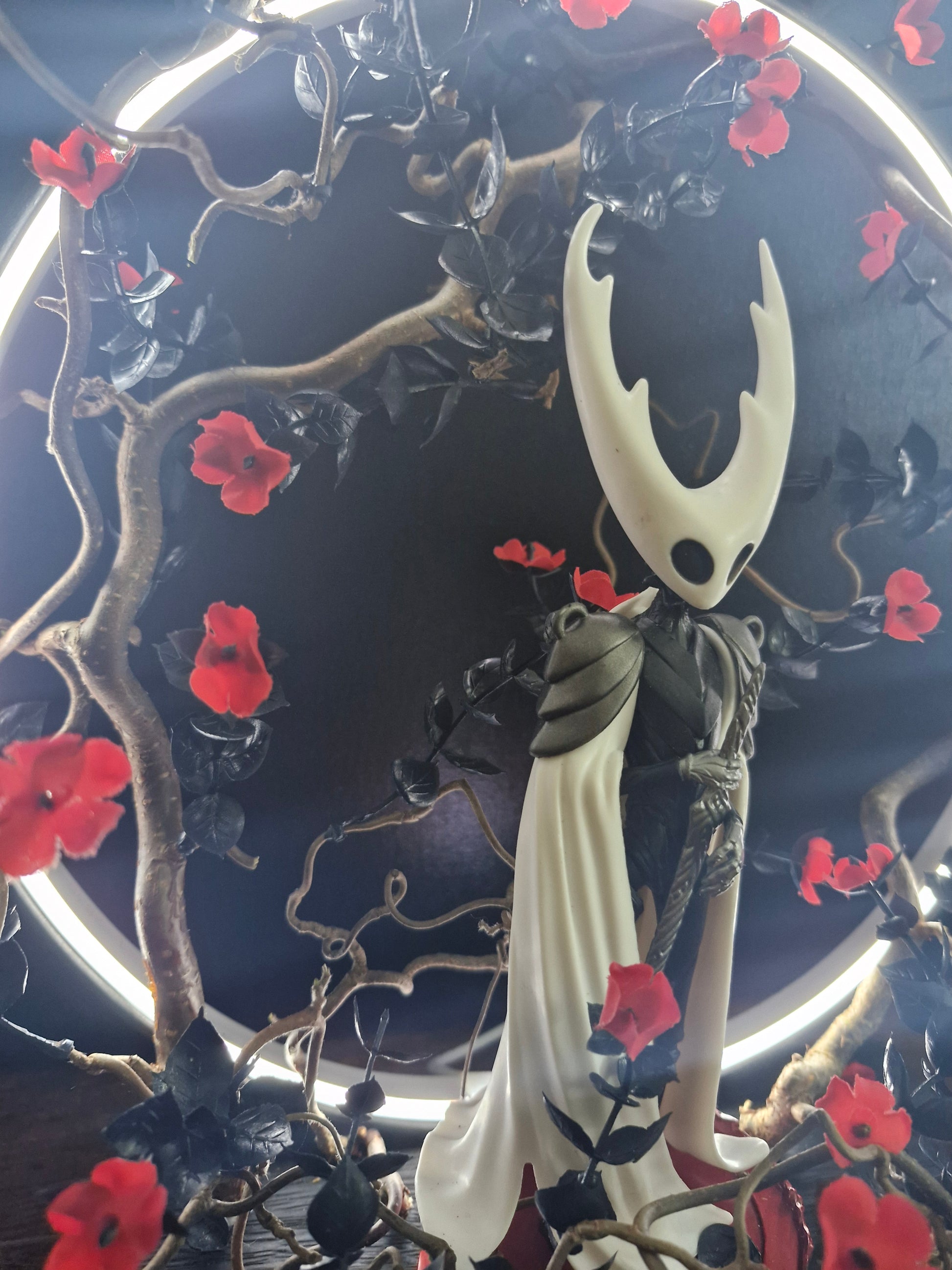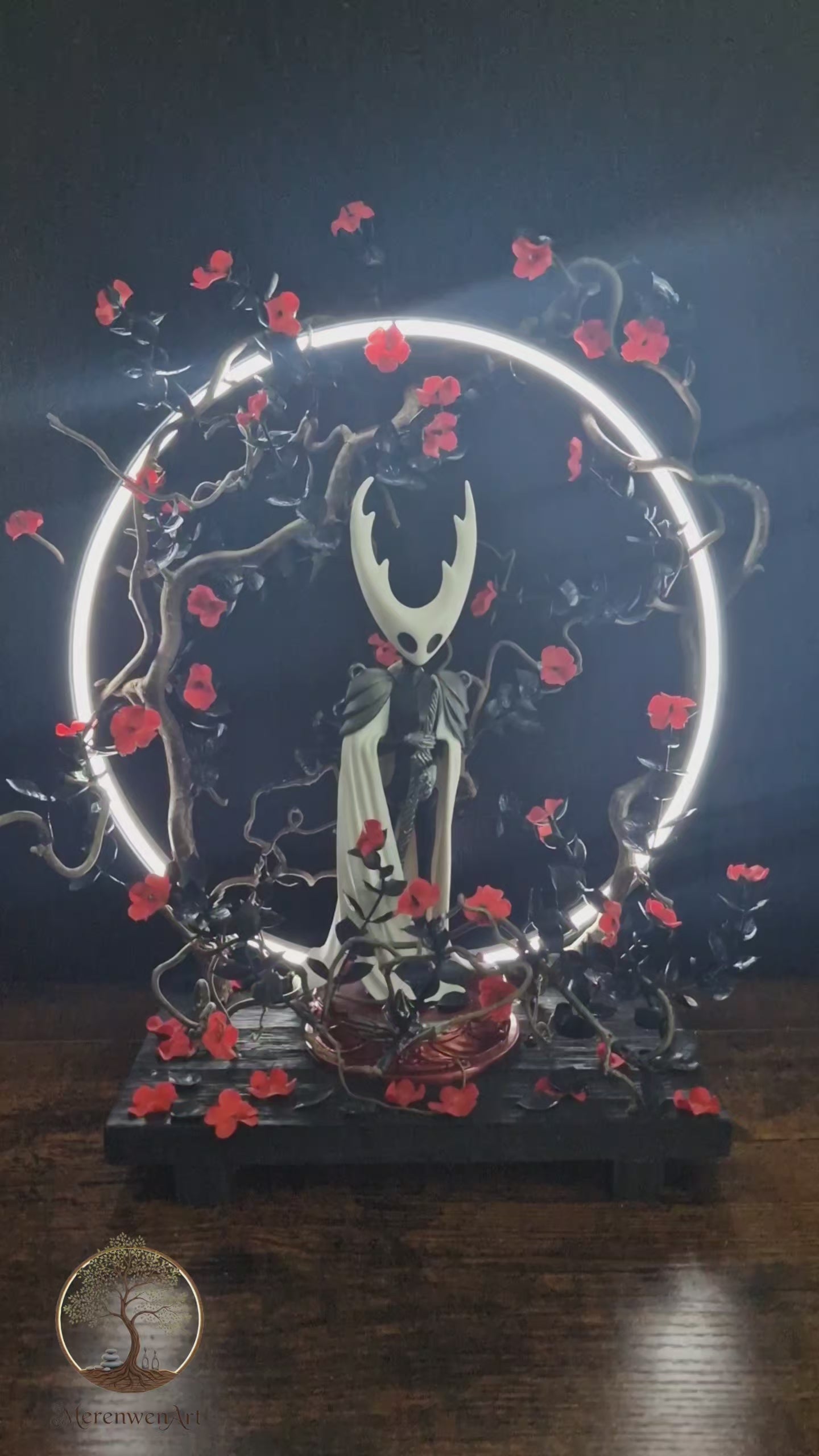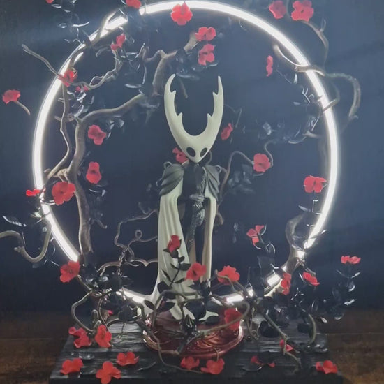 Cette création artisanale rend hommage à l’univers envoûtant du jeu vidéo Hollow Knight. La figurine se dresse au centre d’un cercle lumineux, symbole de passage entre deux réalités, entourée de branches sombres et de fleurs écarlates. Un contraste saisissant entre la pureté et le chaos, la lumière et le vide.