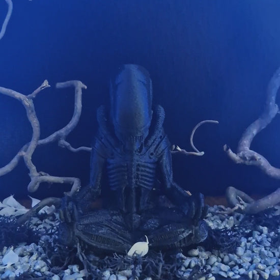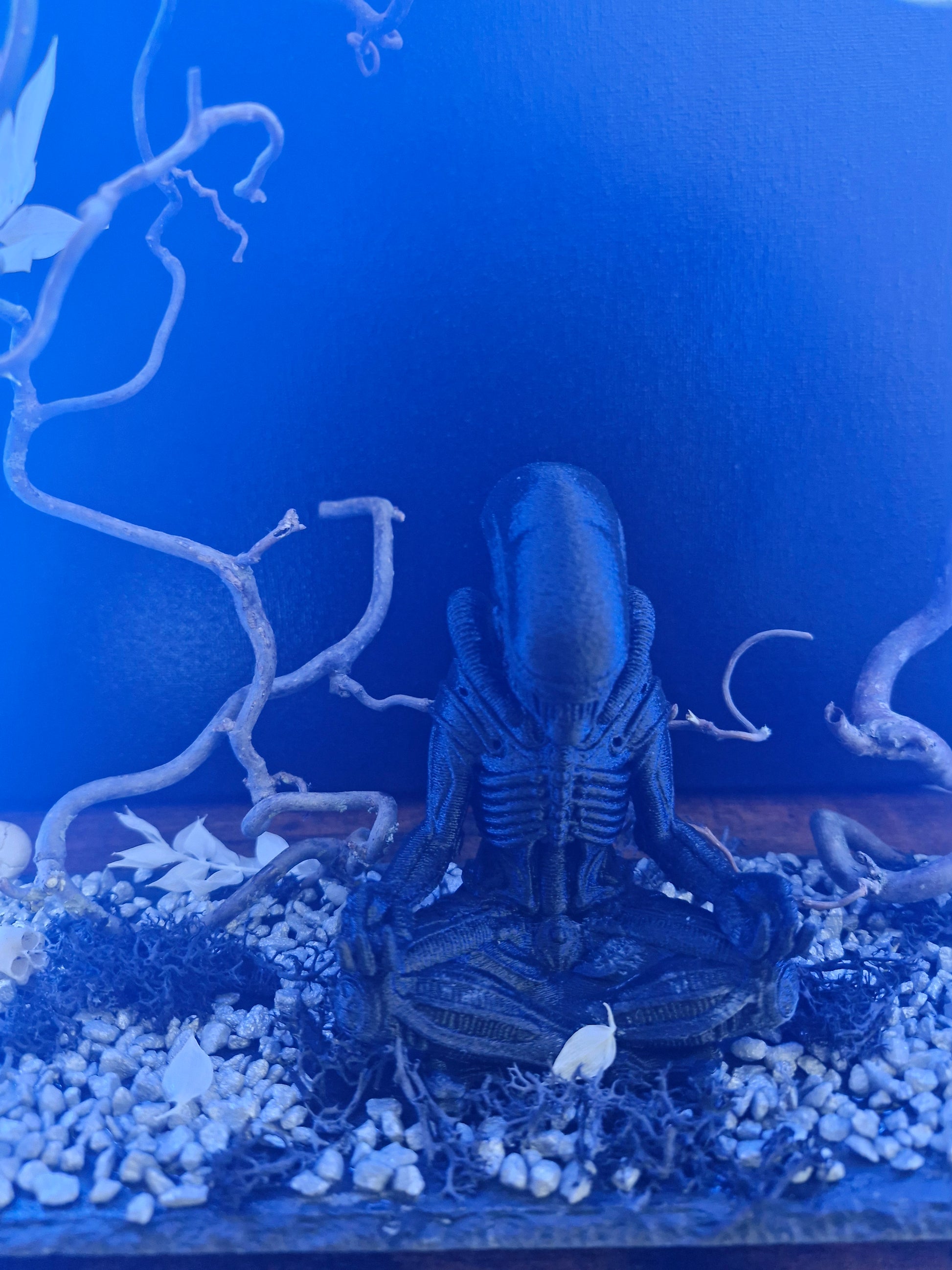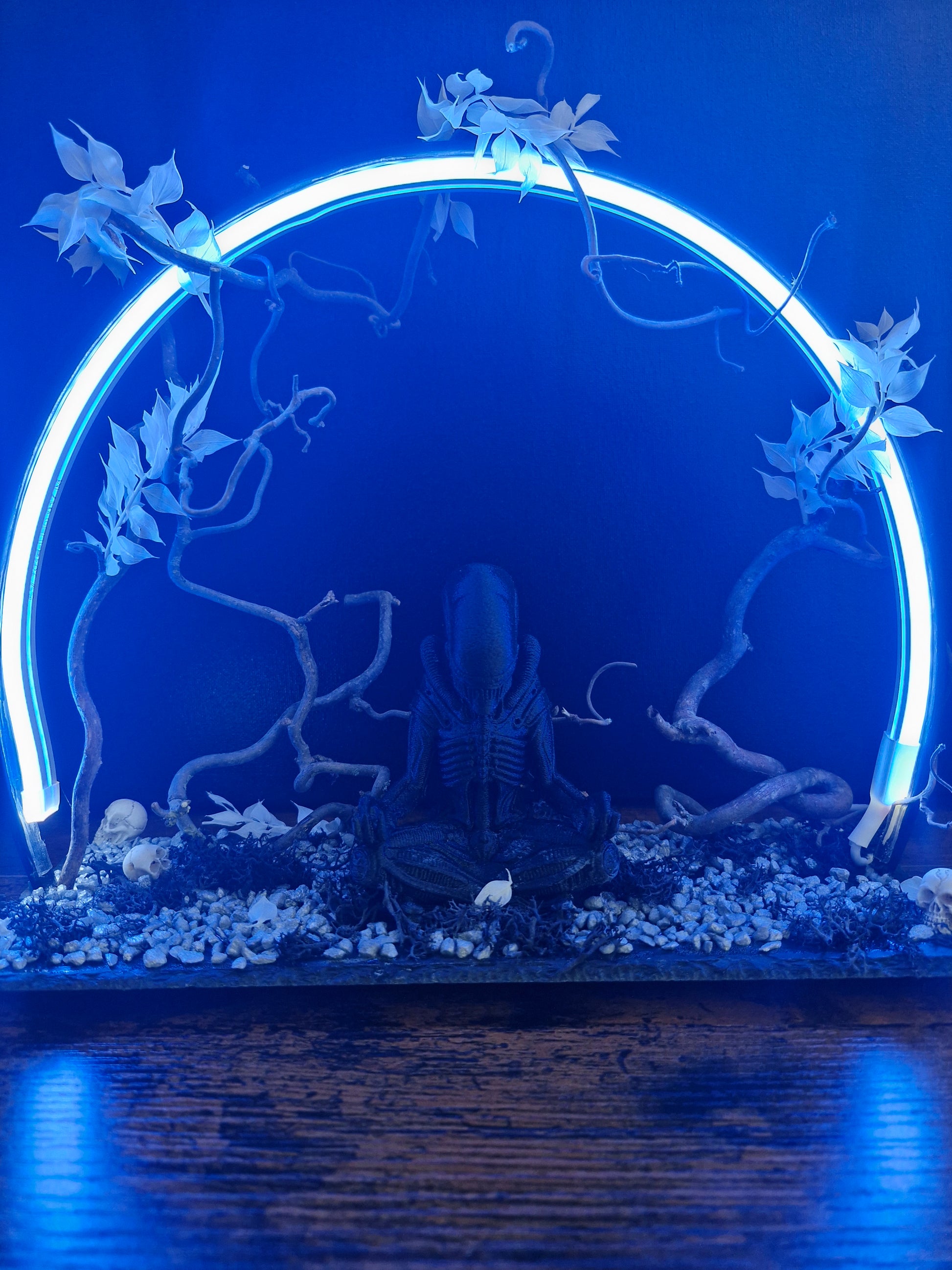 “Silence du Xénomorphe” est une pièce unique réalisée à la main, inspirée de l’univers culte d’Alien. Composée d’une figurine stylisée en méditation, entourée d’un anneau lumineux bleu, de branches sinueuses, de pierres, de mousse noire et de petits crânes, cette création installe une atmosphère mystérieuse et glaciale. Elle s’adresse aux passionnés de science-fiction, de décors sombres et d’art symbolique. Idéale pour une étagère, un bureau, ou comme pièce maîtresse d’une collection.