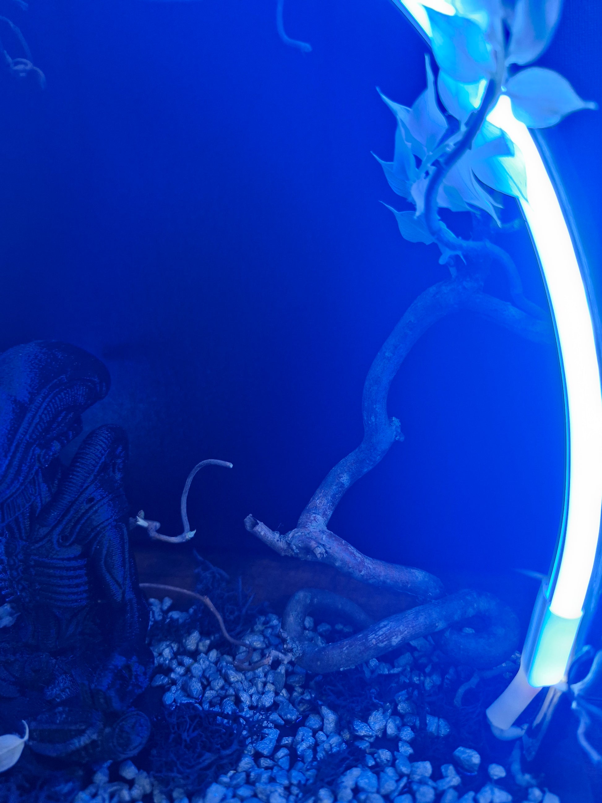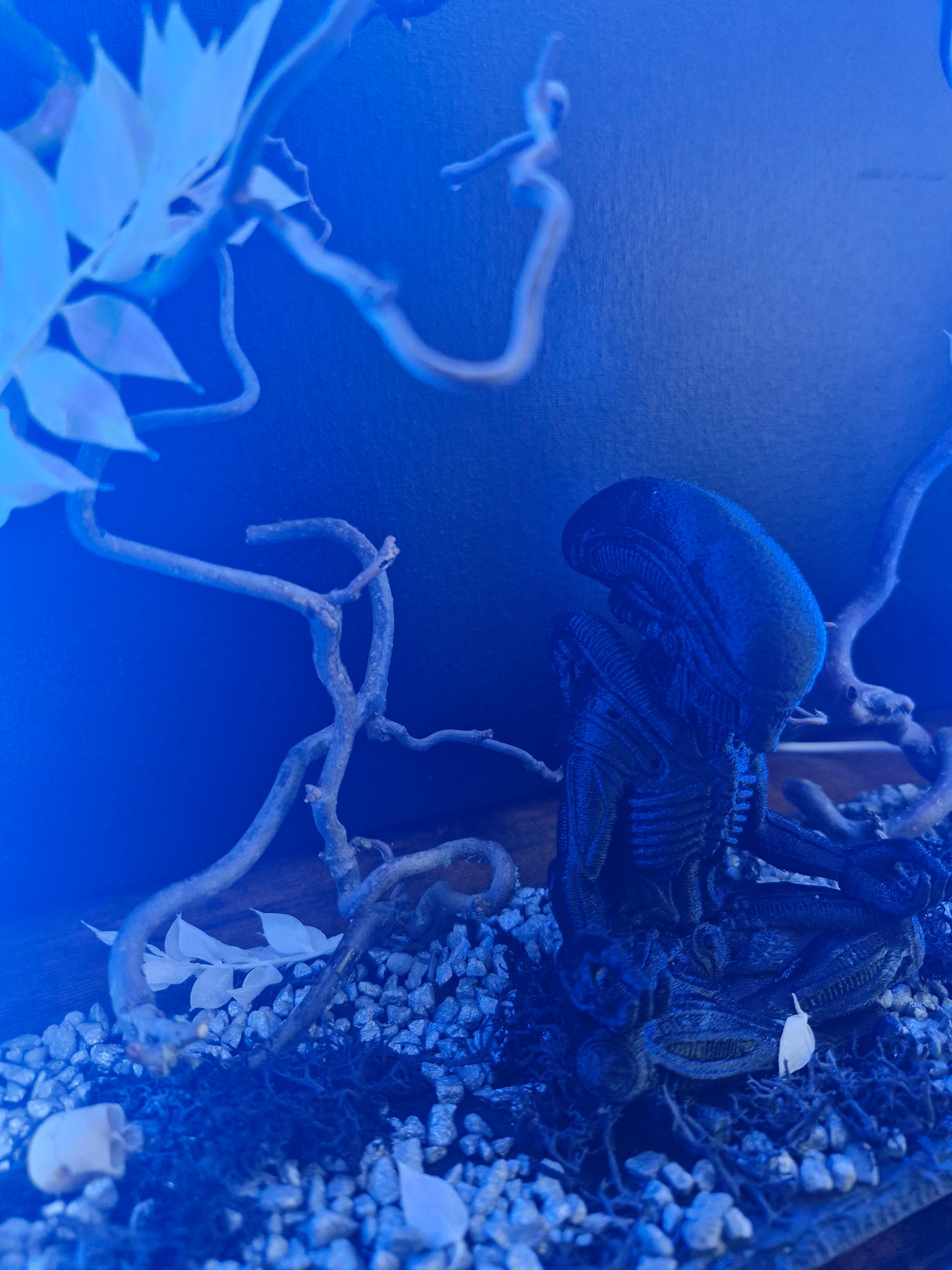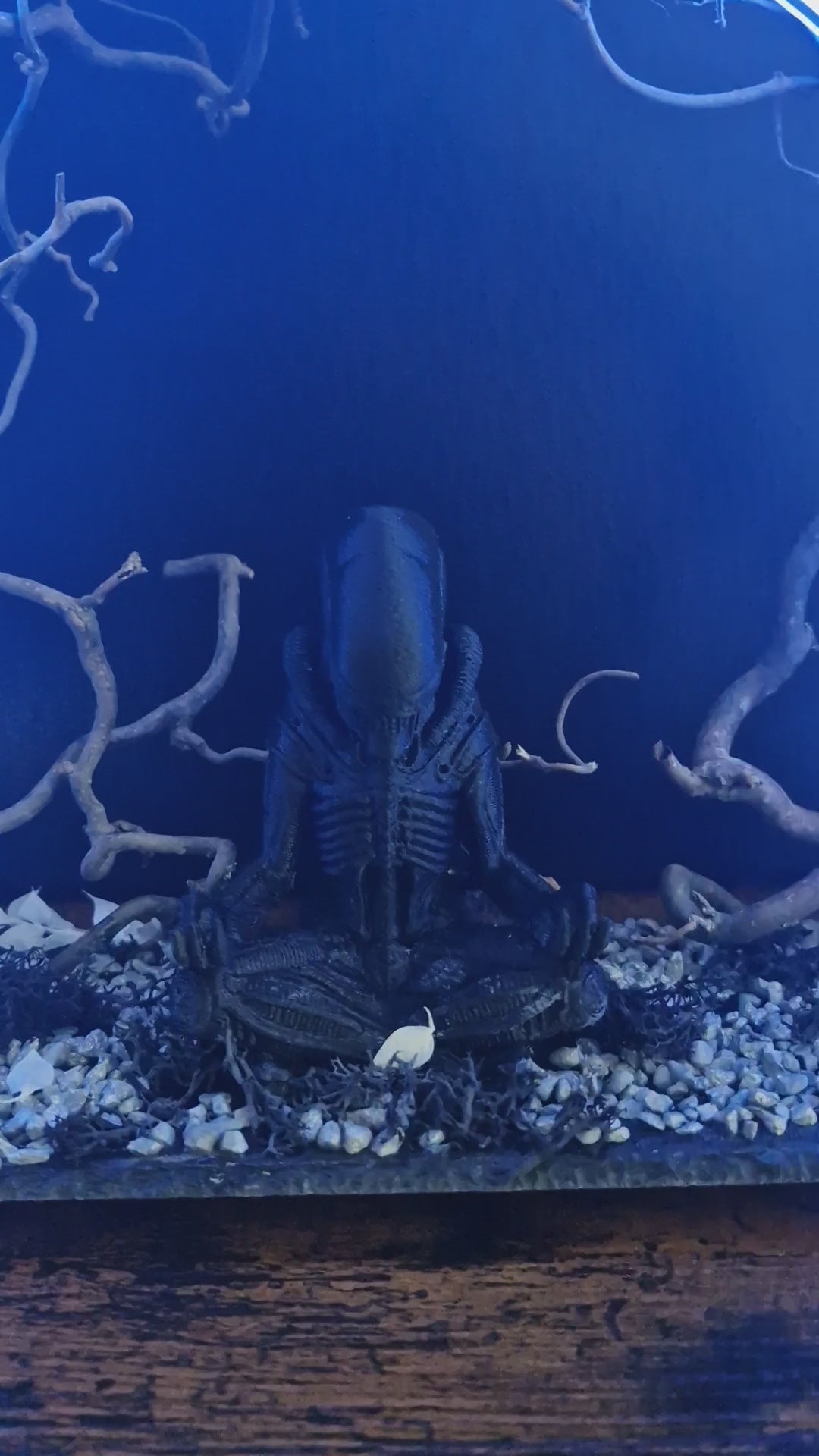 “Silence du Xénomorphe” est une pièce unique réalisée à la main, inspirée de l’univers culte d’Alien. Composée d’une figurine stylisée en méditation, entourée d’un anneau lumineux bleu, de branches sinueuses, de pierres, de mousse noire et de petits crânes, cette création installe une atmosphère mystérieuse et glaciale. Elle s’adresse aux passionnés de science-fiction, de décors sombres et d’art symbolique. Idéale pour une étagère, un bureau, ou comme pièce maîtresse d’une collection.